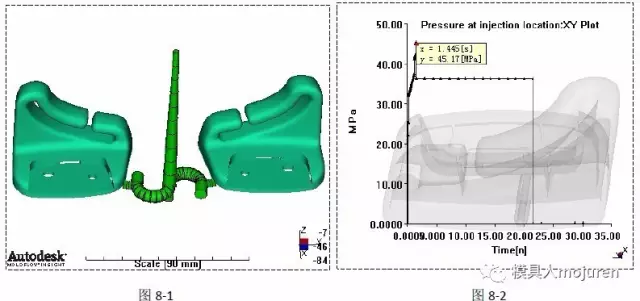 在制品填充的過程中壓力最好不要太大,較大的壓力會使壓力很難均勻的傳遞到產品的各區域,很有可能造成薄壁區域的快速冷卻,繼而阻止后繼壓力的傳遞,形成蝴蝶效應。這種不良的效應破壞性相當大,會造成產品很多方面的缺陷。此產品噴嘴處的壓力及轉換時的壓力,如下圖7-1、7-2所示